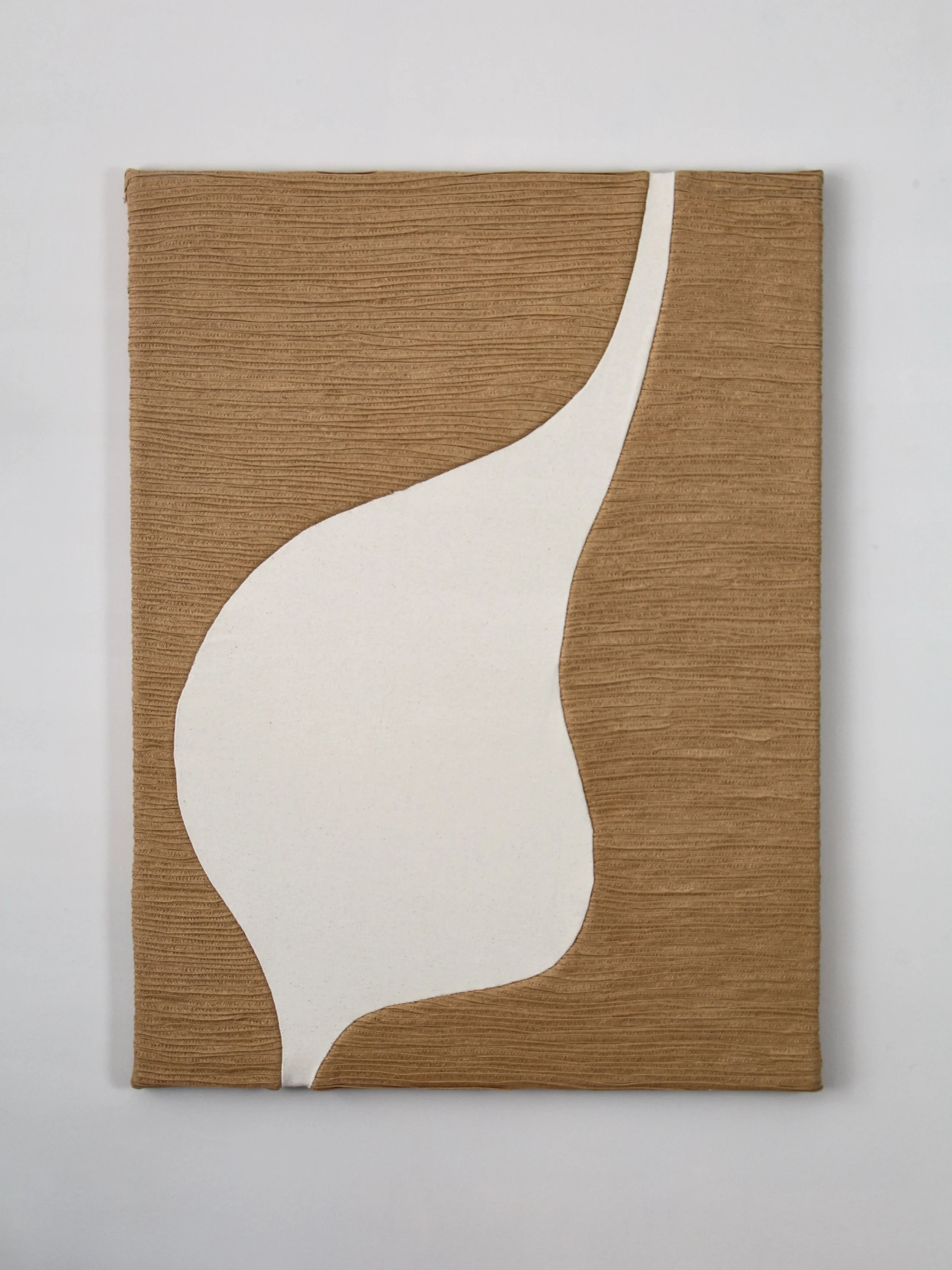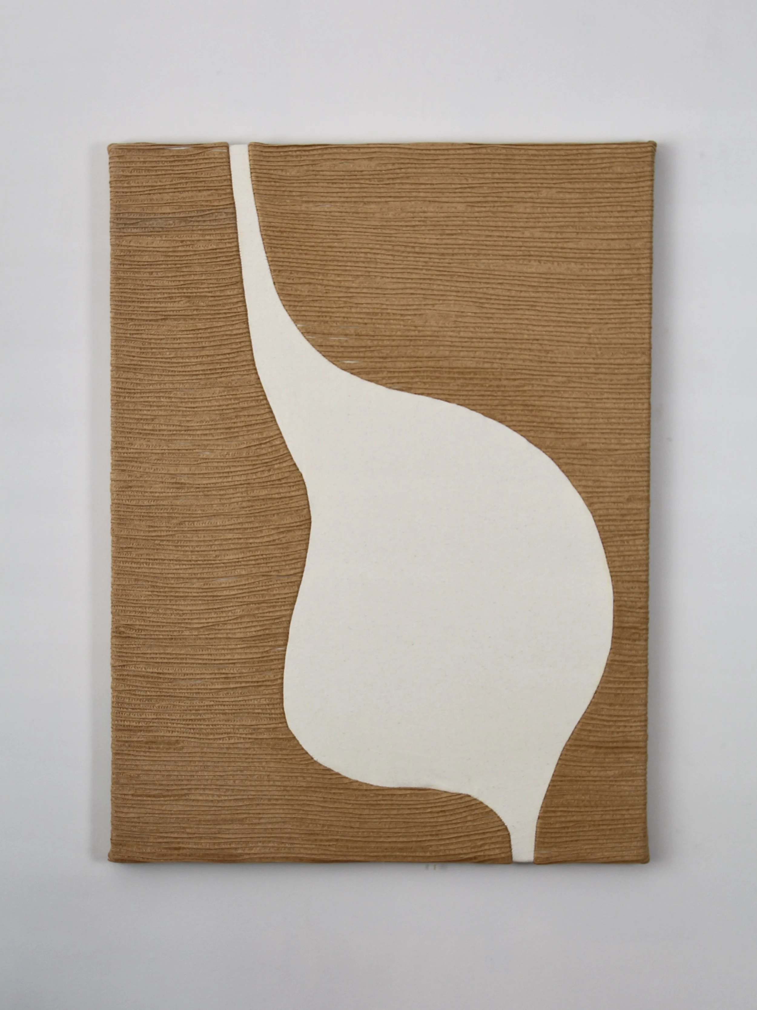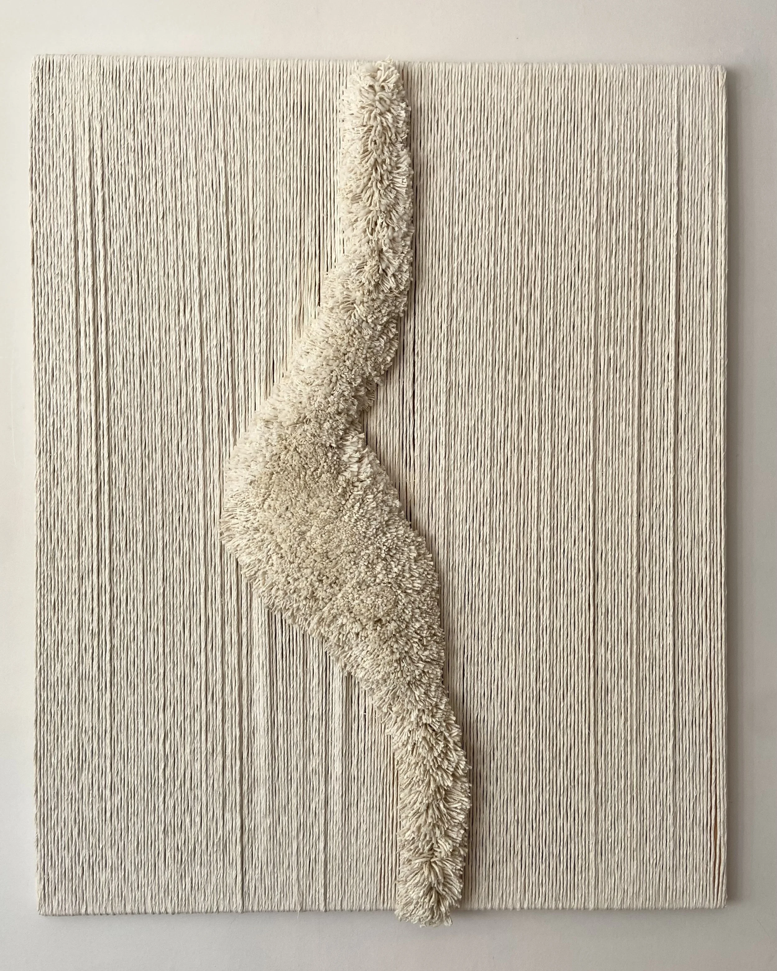This textile series explores how the qualities of intuition and flow that arise naturally in painting can also emerge in textile work. Inspired by the symbolism of water and rivers as emblems of fluidity, time, and change, the works embrace curvy, organic forms and evolving processes. The focus remains on simplicity and the raw material, while movement and rhythm guide both form and technique, allowing new textures to emerge naturally.
